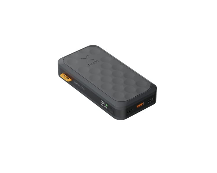 Power Bank Xtorm Fuel Series 20.000mAh com carregamento rápido USB-C PD de 35W. Possui 3 saídas (2x USB-C, 1x USB-A), visor LCD e é fabricado em plástico reciclado. Seguro para viagens de avião.